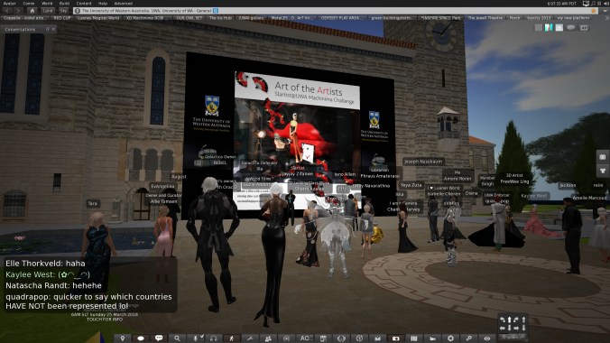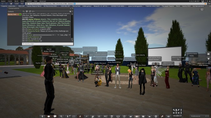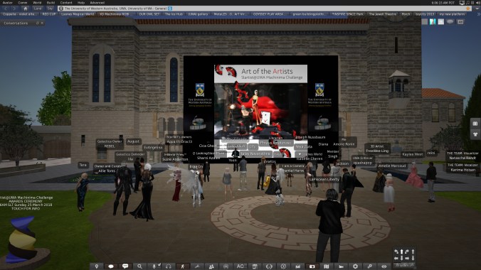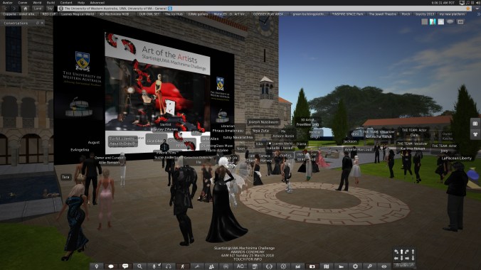 Its been an absolute pleasure for me to work with all of you over the course of these challenges, and over the years, and especially to those who went above and beyond the call of duty to make all of this a success. Thank you for being here. I acknowledge one last time that the UWA Art, Architectural & Machinima Challenges, the teaching & research have seen people from all corners of the globe involved, with students, artists, builders, researchers and machinimatographers hailing from Turkey, Kuwait, Romania, Indonesia, Malaysia, Lithuania, Singapore, Costa Rica, the Philippines, Finland, Greece, India, Colombia, Poland, Norway, South Africa, Sweden, Ukraine, Taiwan, Hungary, Latvia, Russia, Venezuela,  Belgium, Mexico, Wales, Canada, the USA, the UK, Uruguay, Scotland, England, Spain, Switzerland, Italy, France, the French Carribean, Brazil, Argentina, Chile, Denmark,  Holland, Ireland, Northern Ireland, Portugal, Austria, Cuba, Serbia, Tunisia, Germany, Japan, New Zealand, Australia and parts unknown. More