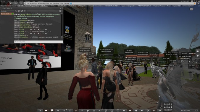 Anyway for this current event, we encouraged connections and collaborations between 3D artists and machinima makers. Any artworks that sat  on the UWA Sims in Second Life at any point in time, going back to artworks created when the sims themselves were created in 2009, could be selected to feature in the machinimas. Filmmakers could choose individual artworks or a collection of artworks around which to weave a story, and machinima makers could work with the artists to film anywhere. It did not have to be shot on these grounds. Much acknowledge here Eliza Weirwight who created the artwork for the poster for this event. She has created the poster for events at UWA for as long as I remember and has always given us something truly special.